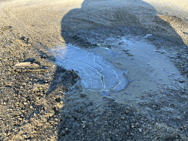 朝はけっこう冷えていたので、水たまりには薄氷が張っていました。