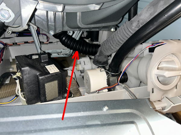 矢印の排水管が、洗濯槽から手前のゴミ取りフィルター側に流れます。