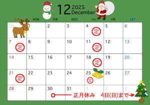 2025/11月 定休日などのお知らせ 2025年10月31日 最終更新日時 : 2025年10月31日 teruo yabuta 毎週木曜、祭日、第一・第三日曜は定休日でお休みとなります。 定休日など営業時間外は転送電話になっており、留守番電話にご伝言下さい。 対応可能な場合はこちらよりお電話致します。よろしくお願いいたします。