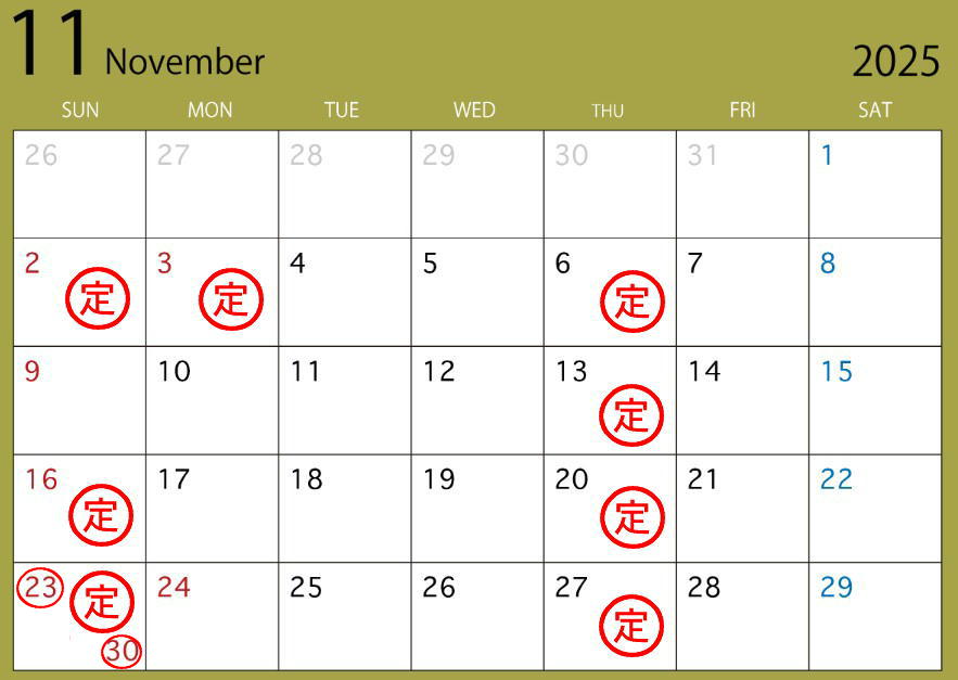 2025/11月 定休日などのお知らせ 2025年10月31日 最終更新日時 : 2025年10月31日 teruo yabuta 毎週木曜、祭日、第一・第三日曜は定休日でお休みとなります。 定休日など営業時間外は転送電話になっており、留守番電話にご伝言下さい。 対応可能な場合はこちらよりお電話致します。よろしくお願いいたします。