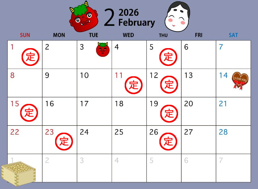 2026/2月 定休日などのお知らせ 2026年2月1日 最終更新日時 : 2026年2月1日 teruo yabuta 毎週木曜、祭日、第一・第三日曜は定休日でお休みとなります。 定休日など営業時間外は転送電話になっており、留守番電話にご伝言下さい。 対応可能な場合はこちらよりお電話致します。よろしくお願いいたします。